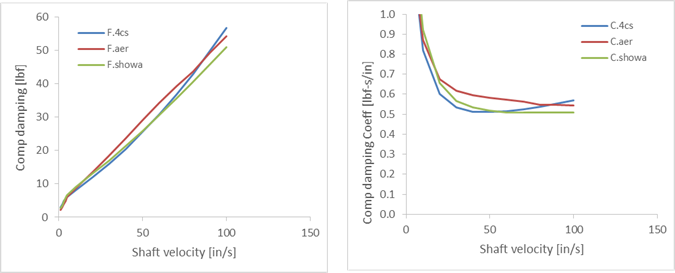 The fork compression damping force is plotted for the three tests. The AER damping force curve is digressive so it will end up with less damping force at high speed. But the difference looks to be small and probably due to the shim stack configuration used in the test.