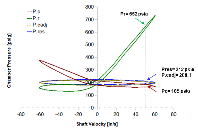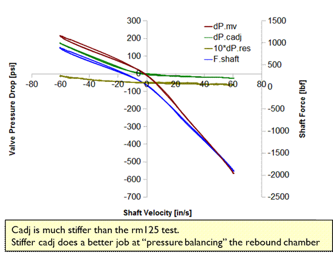 For this 50 in/sec data point on the rebound stroke the pressure drop across the compression adjuster is negative since the shock is trying to suck fluid out of the reservoir. With P.c less than P.res the compression adjuster force is negative for this point.