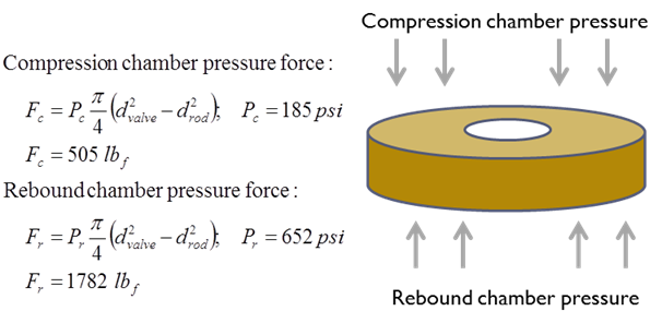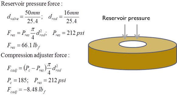 First we compute the force on the shaft from the reservoir gas pressure and the force added by the pressure drop across the compression adjuster.