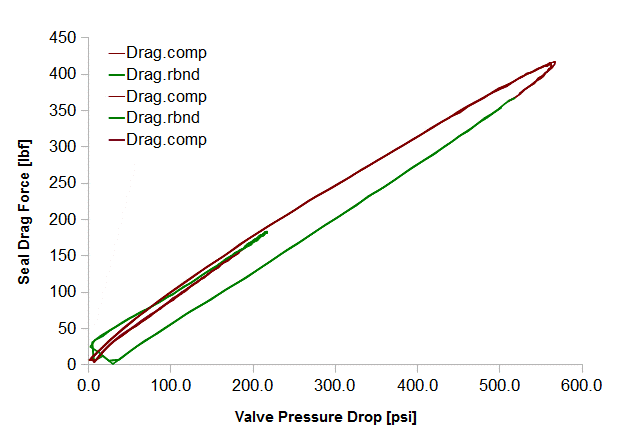 The seal drag force on the compression and rebound stroke both increase as the pressure drop across the valve increases.