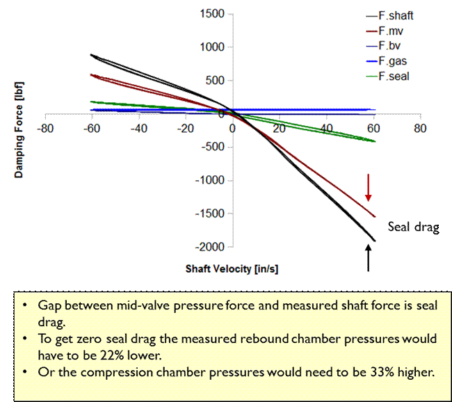 The “gap” between the damping force produced by the mid-valve and the measured shaft force is assumed to be seal drag. If the pressures measured in the rebound chamber were 22% lower the seal drag would work out to be zero. Likewise if the compression chamber pressures were 33% higher the drag force would be zero.